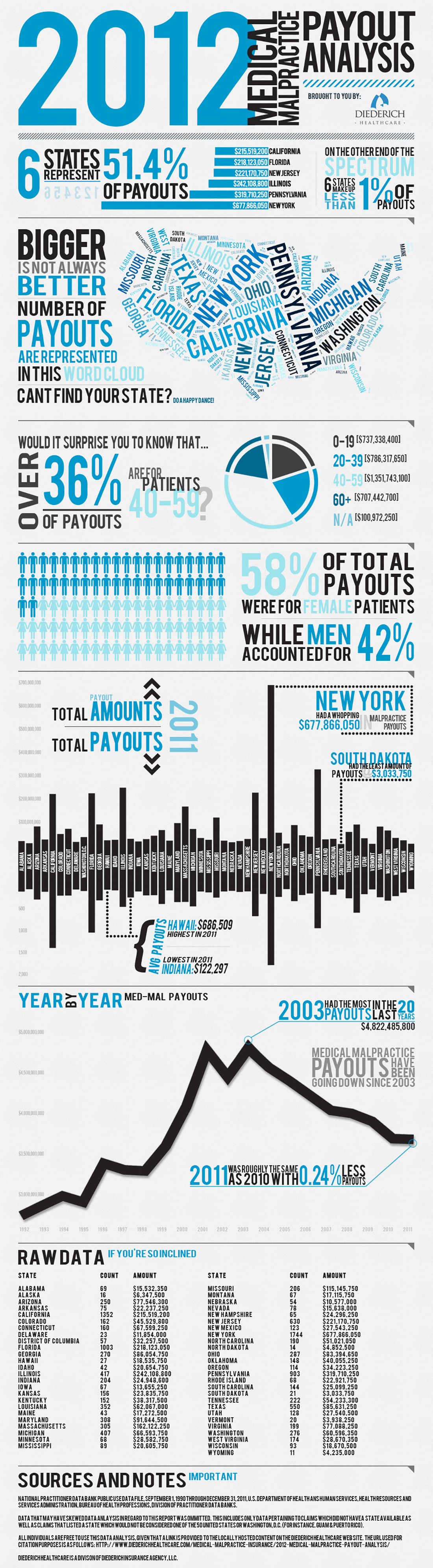 As a service to our clients and all physicians nation-wide, Diederich Healthcare has done an analysis of the medical malpractice payouts in 2011 as recorded by the National Practitioner Data Bank. Taking the data from the NPDB’s records, statistics were selected that will be both interesting and timely to doctors and all other medical professionals. Toward the end of the infographic there is also a line graph depicting the total payout amounts from 1992 to 2011. The data represented in this particular infographic is for the entire United States.